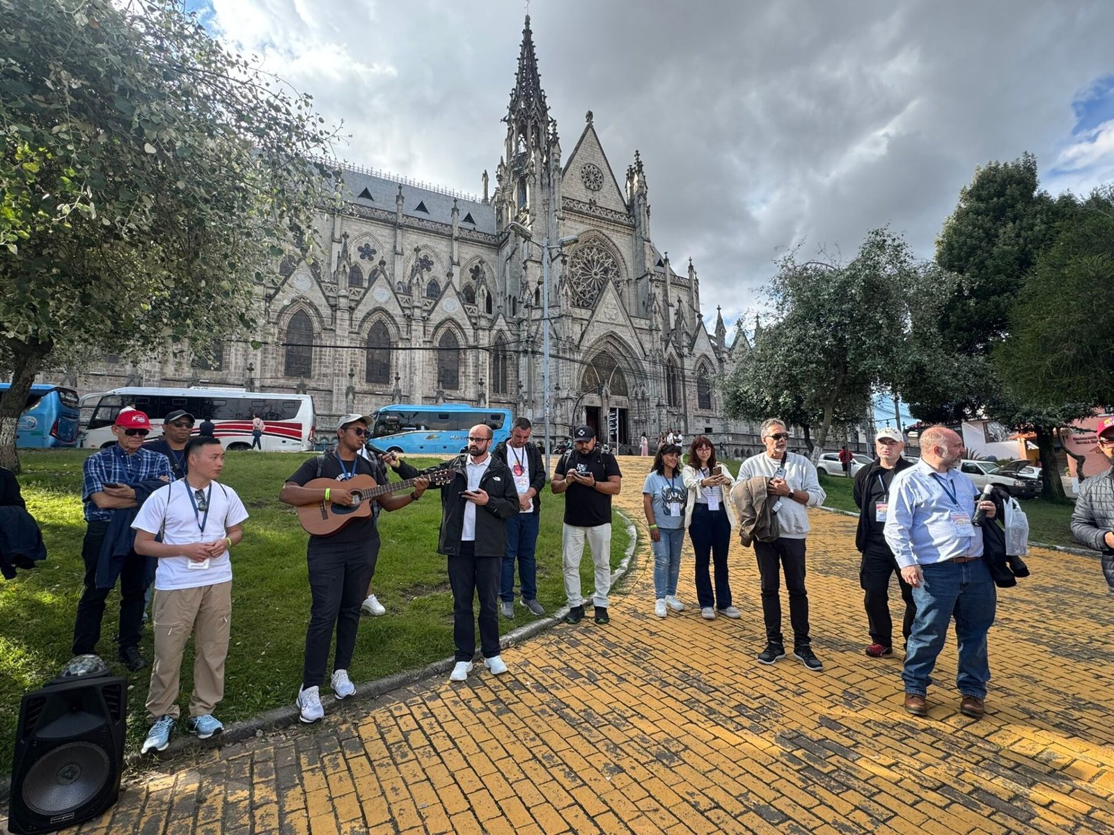 Mais c’est l’après-midi qui fut véritablement fabuleuse, car nous sommes passés devant l’imposante statue de la Virgen de El Panecillo, patronne de la ville de Quito, d’où nous avons pu admirer une vue panoramique extraordinaire sur toute la ville. De là, nous sommes partis vivre l’un des moments les plus intenses et émouvants : le pèlerinage à travers les rues, avenues et parcs de Quito, de la Basilique du Vœu National jusqu’à la petite église El Belén. Pourquoi tant d’émotion ? Parce que nous refaisions et revivions ainsi les pas de nos premiers missionnaires ici en Équateur ! C’était un retour à Bethléem, là où tout a commencé : la Bethléem où Jésus est né, la Belén où l’histoire missionnaire de notre Congrégation a commencé. Pendant que nous parcourions ce bref trajet en priant et chantant, dans le sens inverse marchaient des manifestants, travailleurs réclamant de meilleures conditions de vie, nous rappelant les causes justes que le Père Dehon défendait aux côtés des ouvriers de son époque. Le pèlerinage s’est achevé dans la petite église, par un temps d’Adoration très émouvant.